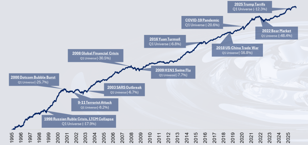 The chart below speaks to this. It is a custom index showing the long-term investment performance of our current Quartile 1 Founders. These are our 80 highest quality founders globally out of a universe of ~800 founder-led stocks. All stocks in our portfolio must be drawn from this Quartile 1 Founders Index. If we zoom out, we see that although each period of adversity felt consequential at the time it ended up becoming more of a speed bump along the way – our founders bounce back again and again and again.